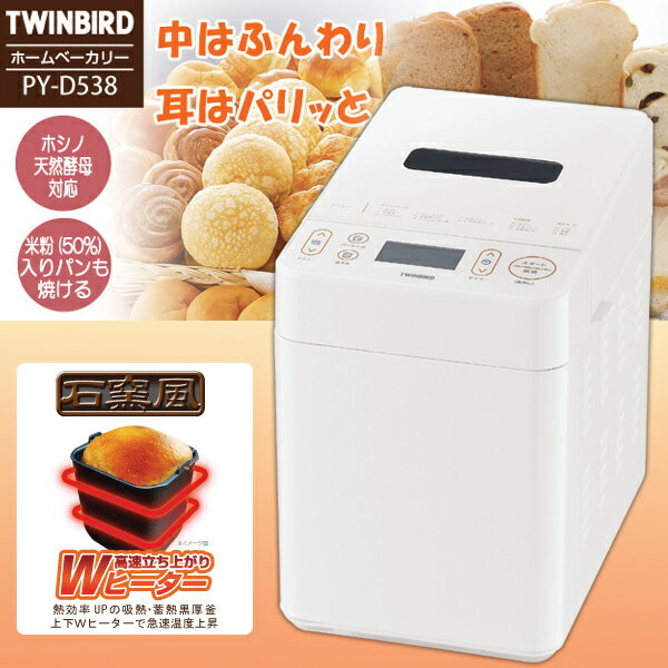 【送料無料】TWINBIRD ツインバード ホームベーカリー PY-D538W【D】楽天HC【e-netshop】【家電】□□□【smtb-s】【2010_野球_sale】 送料無料 価格: 17,800円 ・Wヒーター&蓄熱黒厚釜で石窯風の焼き上がり・ドライイースト自動投入機能&自動具入れ機能搭載・お手入れが簡単な天面フラット構造・天然酵母(ホシノ天然酵母パン種)対応/米粉入りパン対応・アレンジパンも手軽に出来る独立モード搭載・停電時自動復帰メモリー機能付●製品寸法(約) 幅235×奥行325×高さ330mm ●製品質量 [付属品含む](約) 8.3kg ●電源 AC100V 50/60Hz ●消費電力 ヒーター 600W/モーター 110W ●容量 食パンの場合:1.5斤/1斤 タイマー 13時間(焼き上がりまで) ●電源コード長 1.4m ●付属品 計量カップ、計量スプーン、生種カップ、ふた (更新日時:2011/01/23 17:40) Supported by 楽天ウェブサービス |